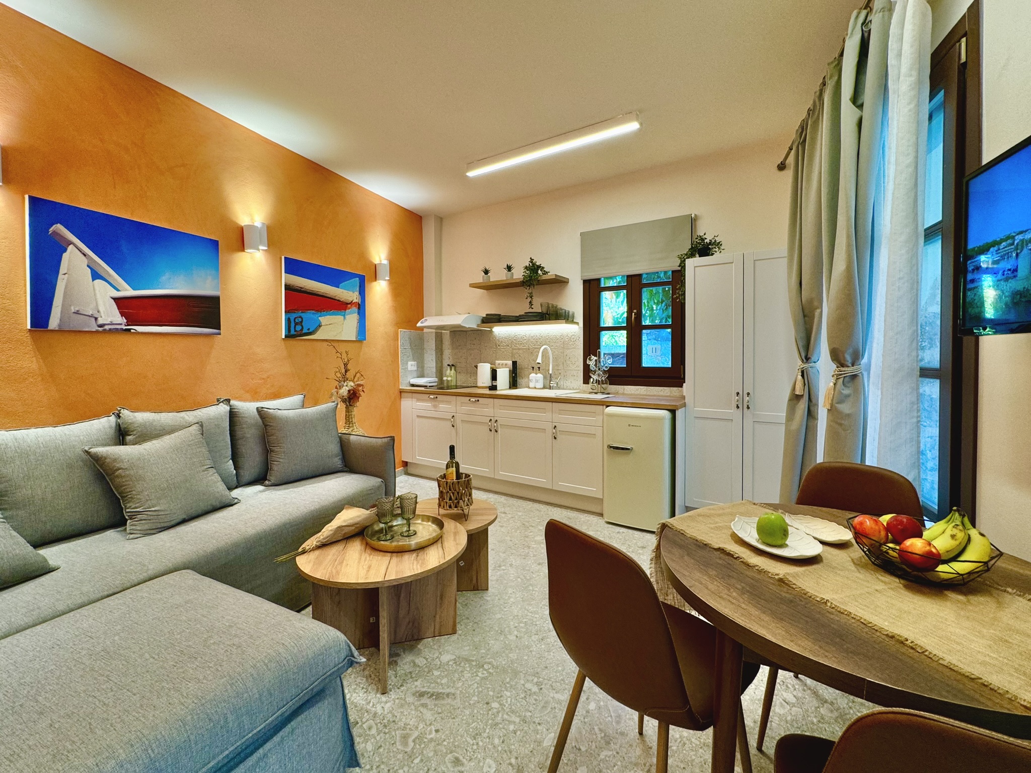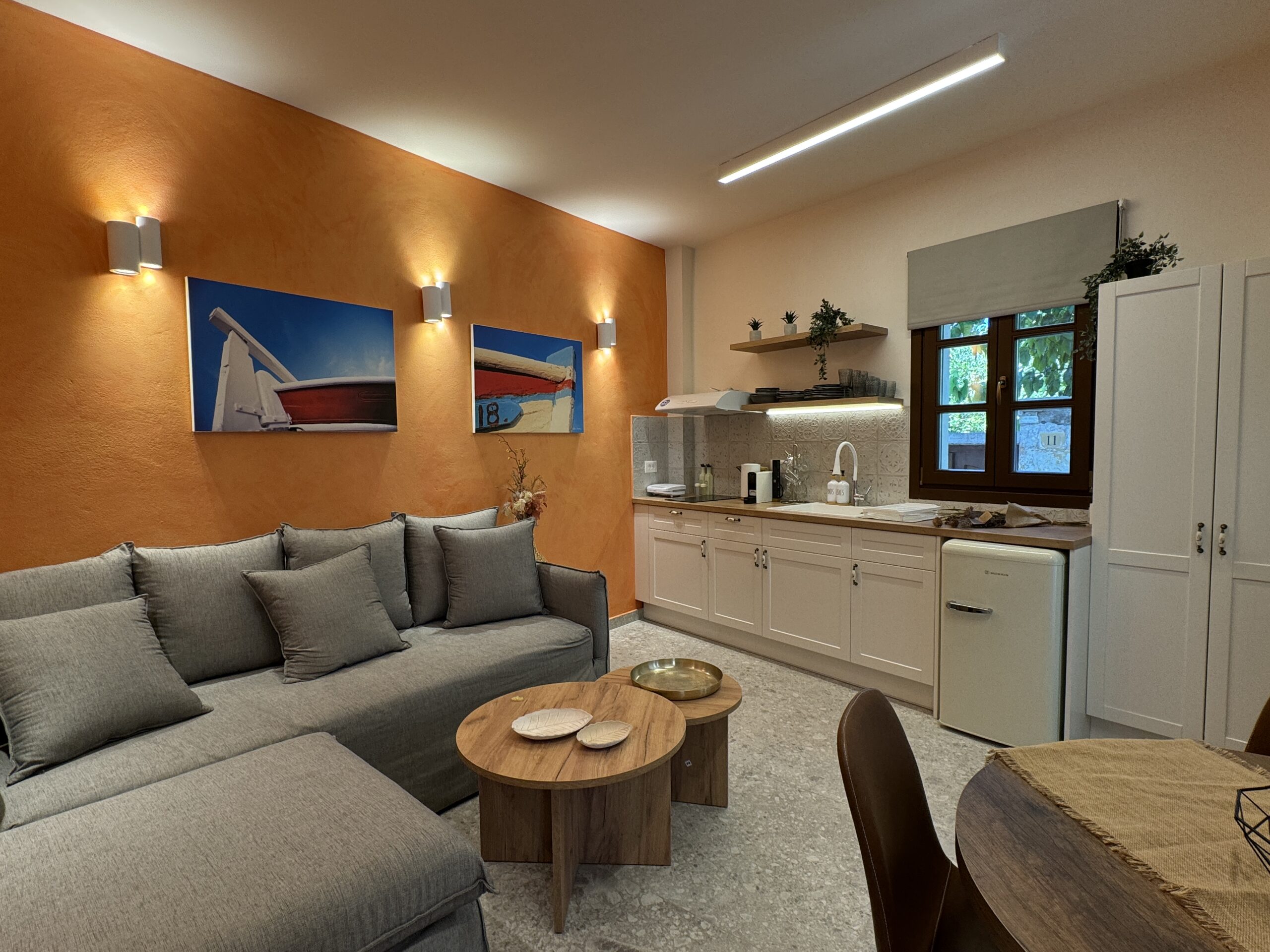 Στο συγκρότημα υπάρχουν 4 διαμερίσματα, καθώς κάθε κτίριο περιλαμβάνει 2 διαμερίσματα, 1 στο ισόγειο και 1 στον πρώτο όροφο. Όλα τα διαμερίσματα χαρακτηρίζονται από υψηλής αισθητικής σχεδιασμό που συνδυάζει τη σύγχρονη πολυτέλεια με τα παραδοσιακά στοιχεία του νησιού.